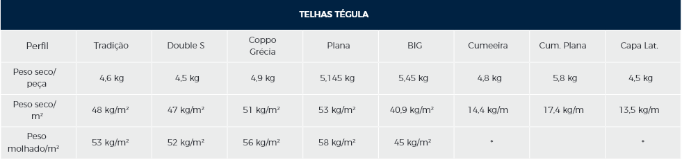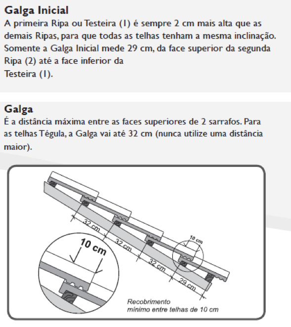 A Tégula indica apenas o tamanho da galga – que é o espaçamento entre as ripas e a bitola delas – que deve ser de, no mínimo, 5 cm x 2 cm.