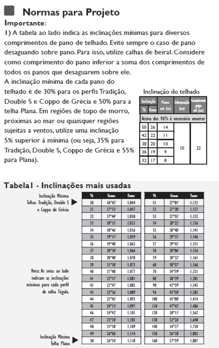 Essas informações estão indicadas no item 1 do Folheto Técnico, na seção Normas para Projeto e na Tabela I – Inclinações mais usadas.