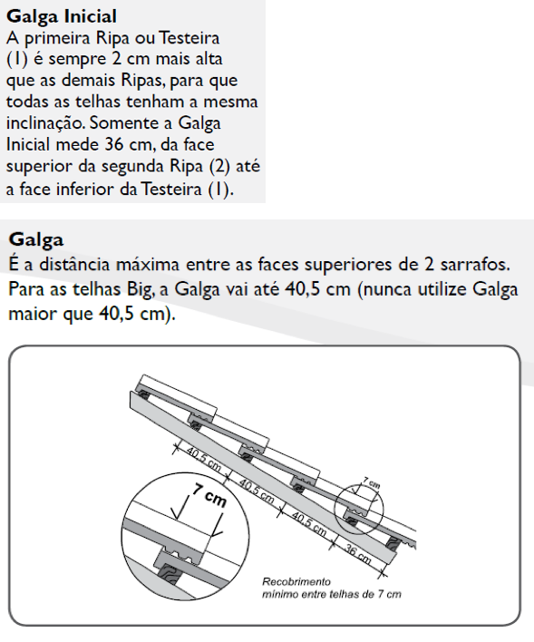 • A galga máxima para os perfis 10,4 peças/m² é de 32 cm, já a galga inicial (distância entre ripas na primeira fiada do beiral) é de 29 cm.