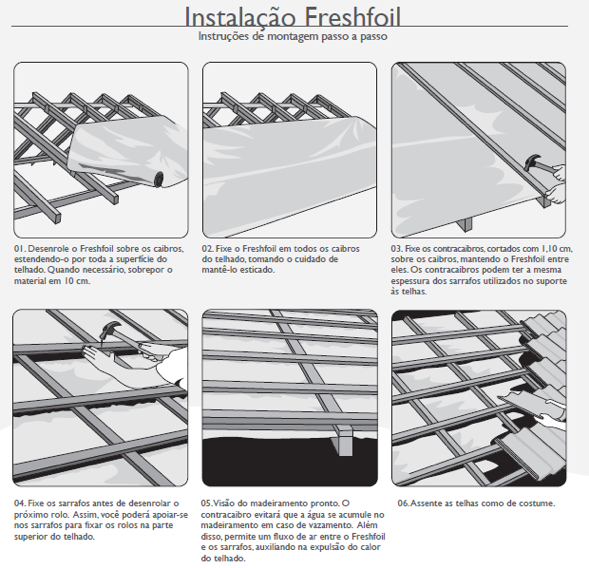 A instalação deve ser feita sobre os caibros, desenrolando os rolos horizontalmente e, depois, fixando a manta com os contracaibros (uso obrigatório).