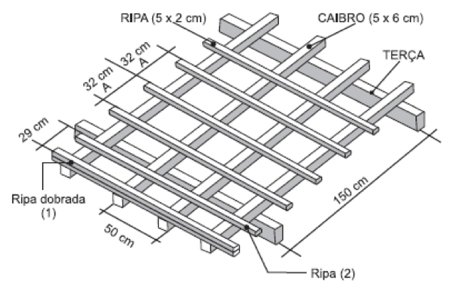 • Ripas (ou sarrafos): 5 cm x 2 cm, com galga máxima de 32 cm.