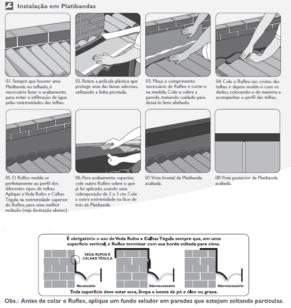 Para a aplicação do Ruflex, a superfície de contato (parede e telha) deve estar limpa, lisa e seca. Para as paredes que estiverem soltando partículas, recomenda-se a aplicação de fundo selador.