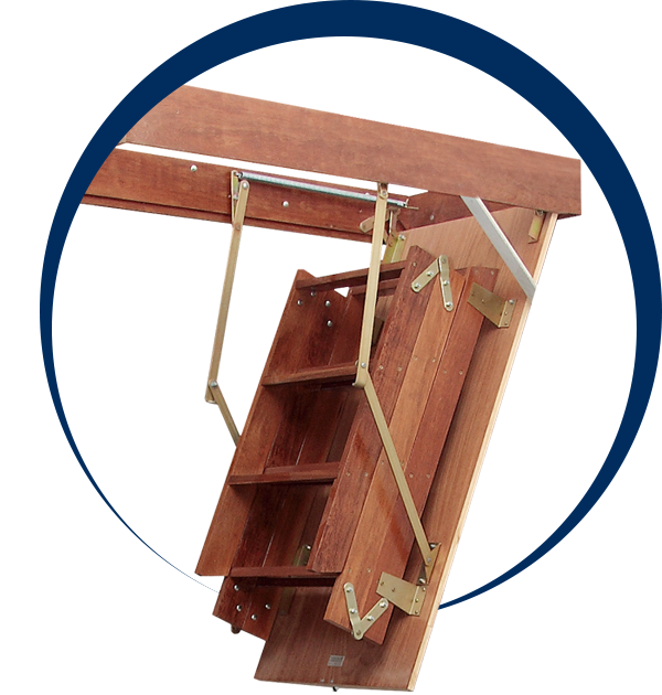 - Materiais: Escada em madeira, molas, dobradiças, corrimão, buchas e parafusos