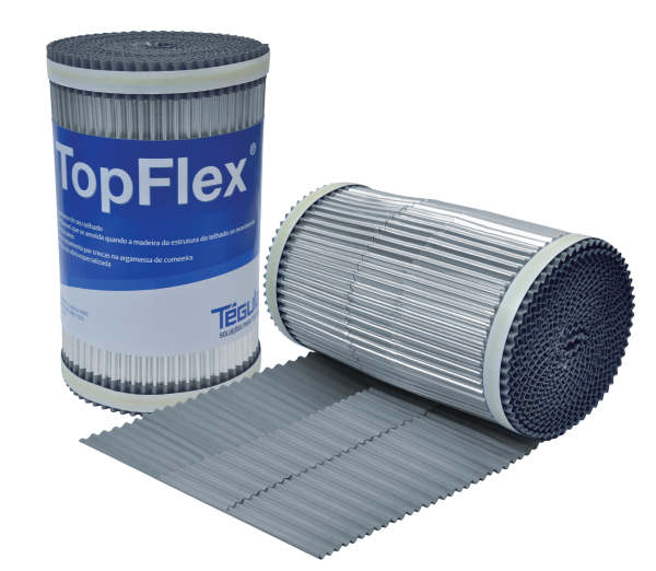 Utilizado no sistema de fixação seca de cumeeiras e espigões, o TopFlex é uma manta flexível e adesiva que elimina o uso de argamassa. A aplicação é feita em conjunto com hastes para fixação de sarrafo de cumeeiras e com clipes de cumeeira.